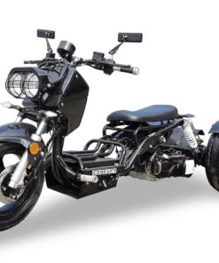 The IceBear PST150-19N 150cc Maddog Trike is an efficient way to get around wrapped in classic Honda Ruckus style! The 150cc air-cooled engine has more than enough power to handle inner city commutes with ease, and you can ride hassle-free with a reliable electric starter and an automatic CVT transmission. The retro rat rod body with exposed frame is supported by a full suspension setup with dual rear shocks. Dual hydraulic disc brakes and super-wide tires provide serious stopping power you can count on! Features also include a full set of gauges on the dash, turn signals, side mirrors, and bright LED headlights. The Maddog trike is sure to turn heads with it’s upswept muffler and rat rod style! EPA approved and CARB exempt. Great selection of colors!