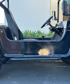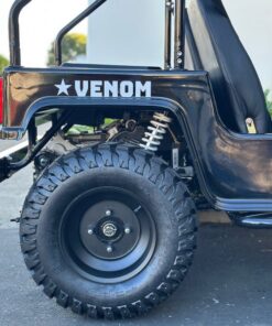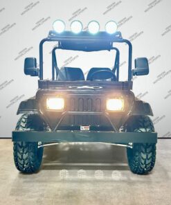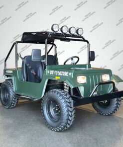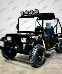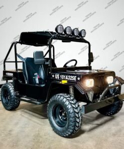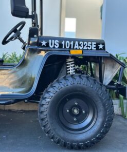 The Venom 200cc Mini Jeep, Willys Edition, is a full-size, automatic vehicle that runs on 200cc of gas. As an army golf cart, it offers reliable and powerful performance, making it perfect for off-road adventures. With its full-size design, it ensures comfortable seating and plenty of space for all your gear.