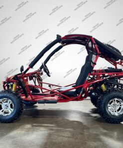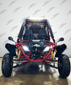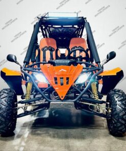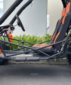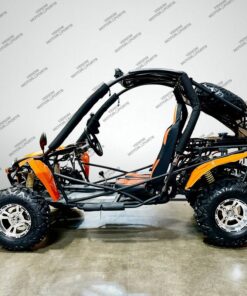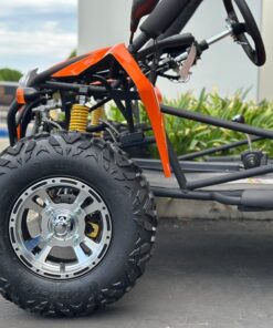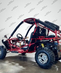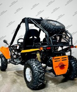 The 200cc Venom Captain Go Kart is a fully automatic 2-seater dune buggy with carbureted engine, headlights, chrome wheels, signal lights, seat belts, free spare tire and other premium features.